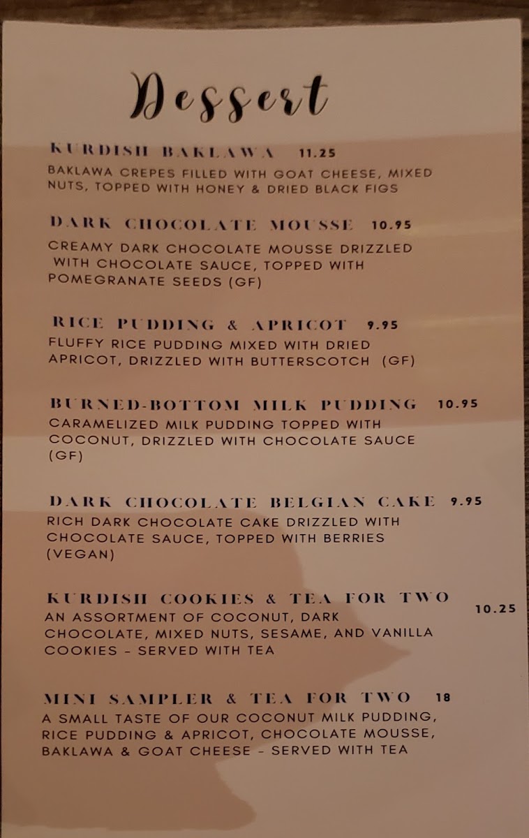 A small taste of our coconut milk pudding, rice pudding and apricot, chocolate mousse, baklawa and goat cheese. Served with tea for 2.